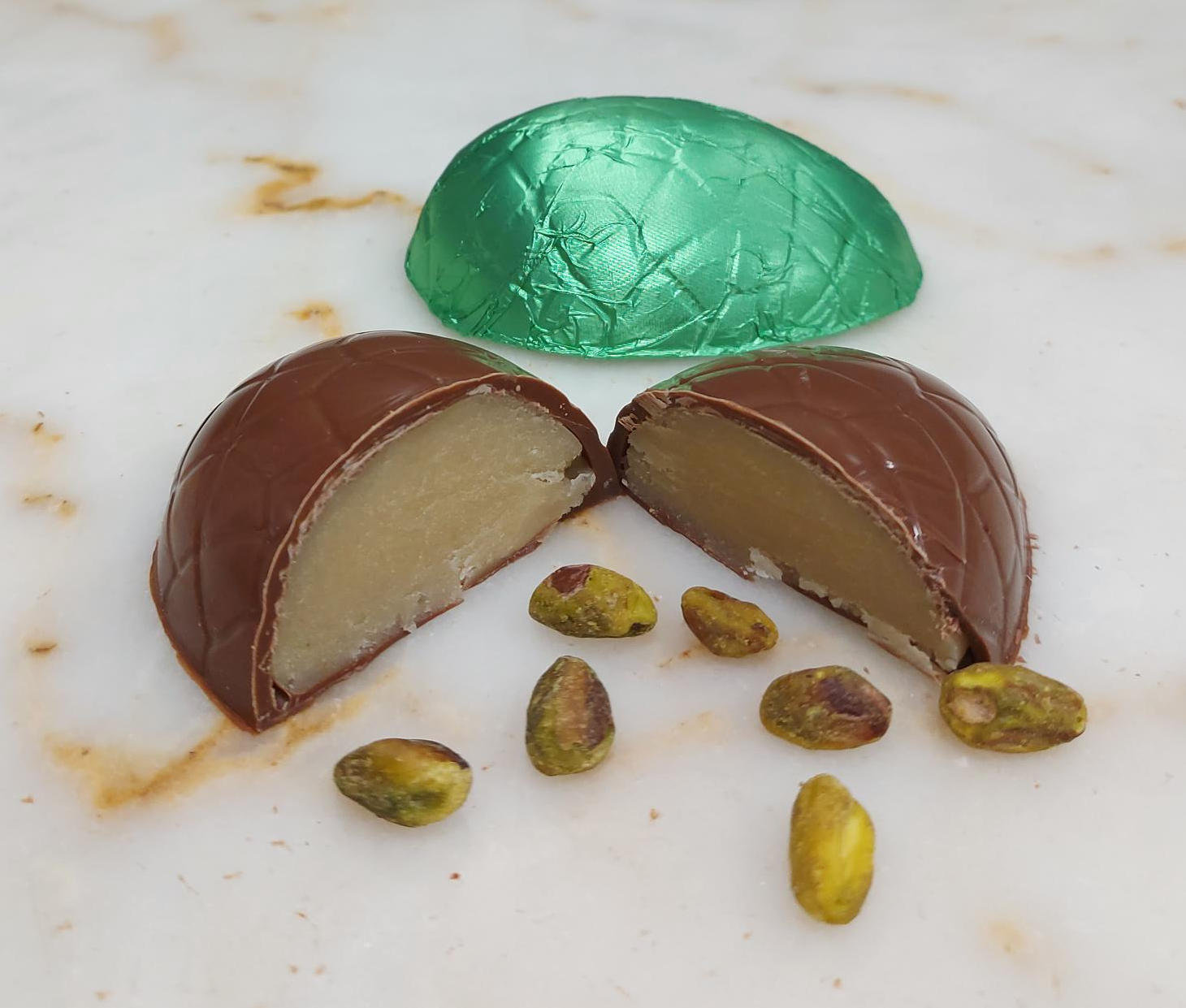 half ei (8cm) gevuld met pistache marsepein (50g). verkrijgbaar in melk en pure chocolade.