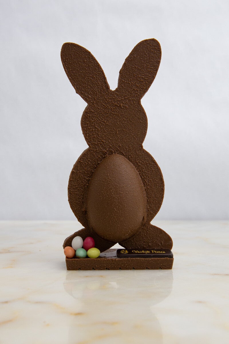 Chocolade konijn (18cm hoog) met 175g paaseitjes errond.