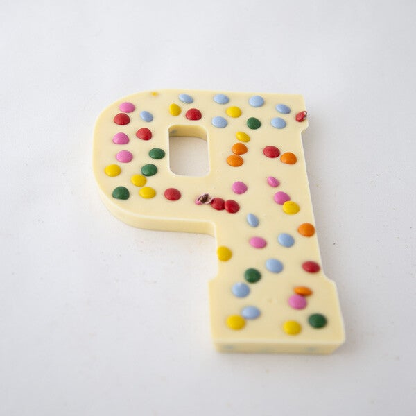 keuze uit een topping (in de letter en op de achterkant) van smarties, crispie bolletjes, noten & rozijnen
