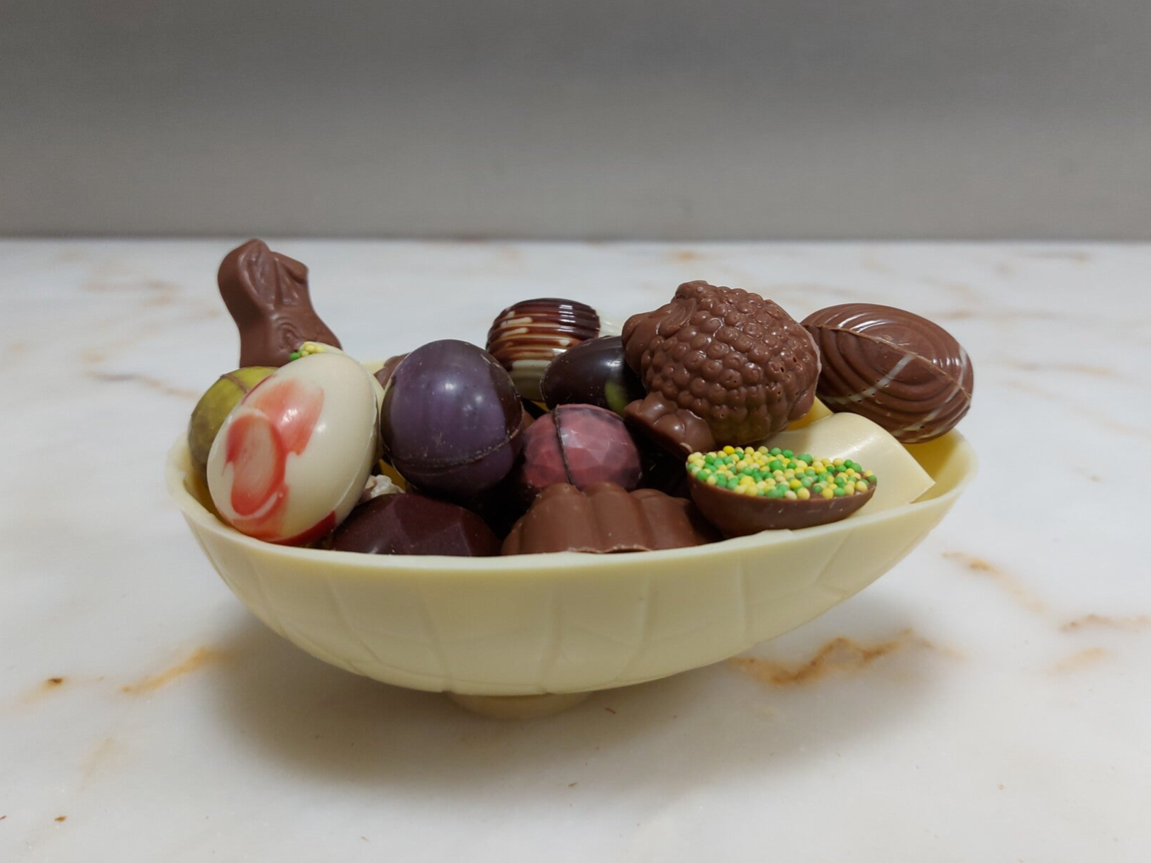 luxe ei + 230g paaseitjes in een transparante doos van 10x10x22cm